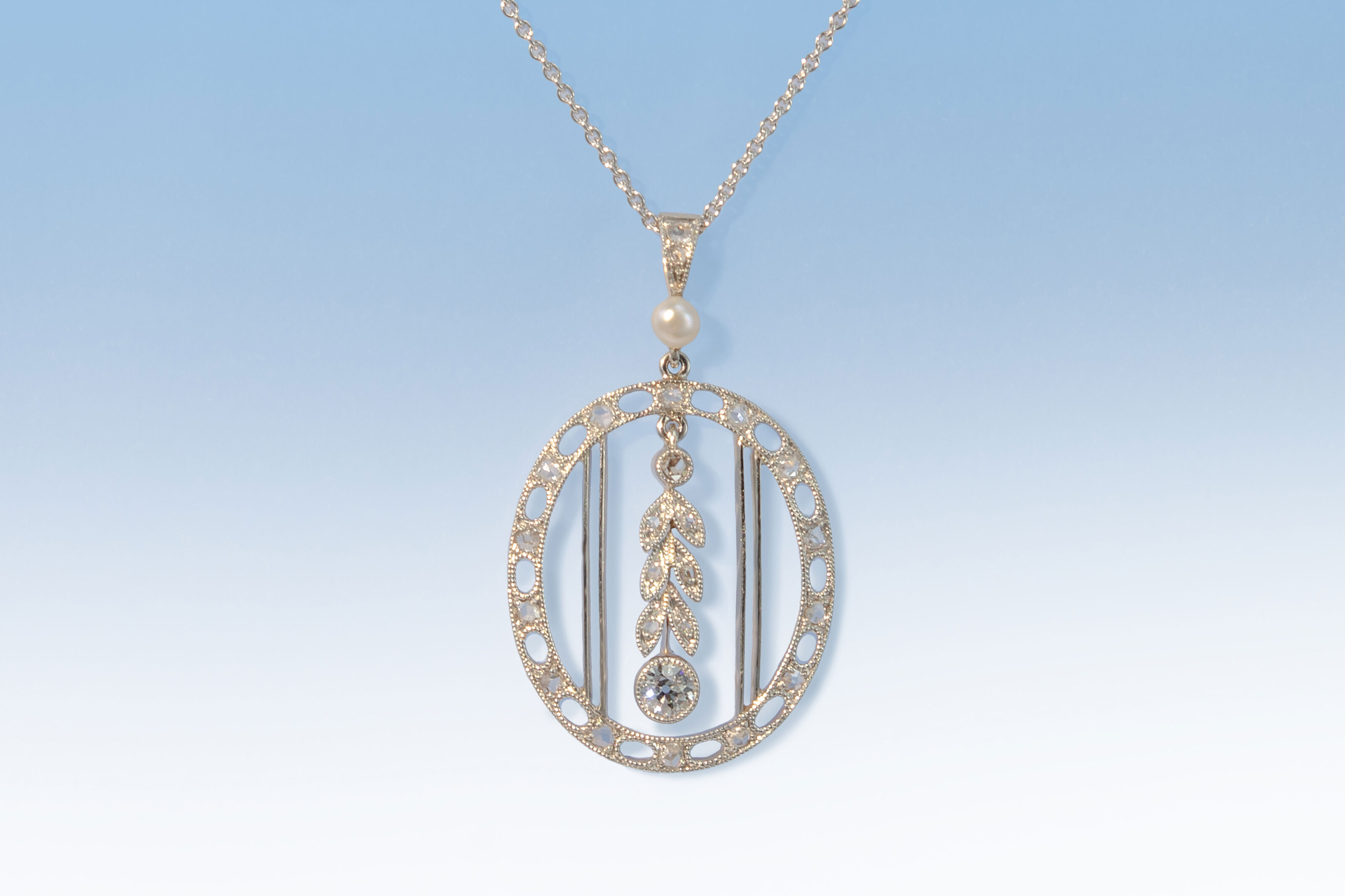 Ein sehr ansprechender und zierlicher Anhänger aus der sogenannten Belle Epoque, der "schönen Zeit" in Europa um die Jahrhundertwende (ca. 1870-1920). Er ist kunstvoll durchbrochen gearbeitet, aus Rotgold 585 mit einer Schicht Platin auf der Vorderseite. Ein Diamant im Altschliff mit Durchmesser 3.7 mm und 23 kleine Diamanten im Rosenschliff sind darin eingefasst worden. Das Oval misst 20 x 24 mm und auf der Aufhängeoese thront ausserdem eine kleine Naturperle.