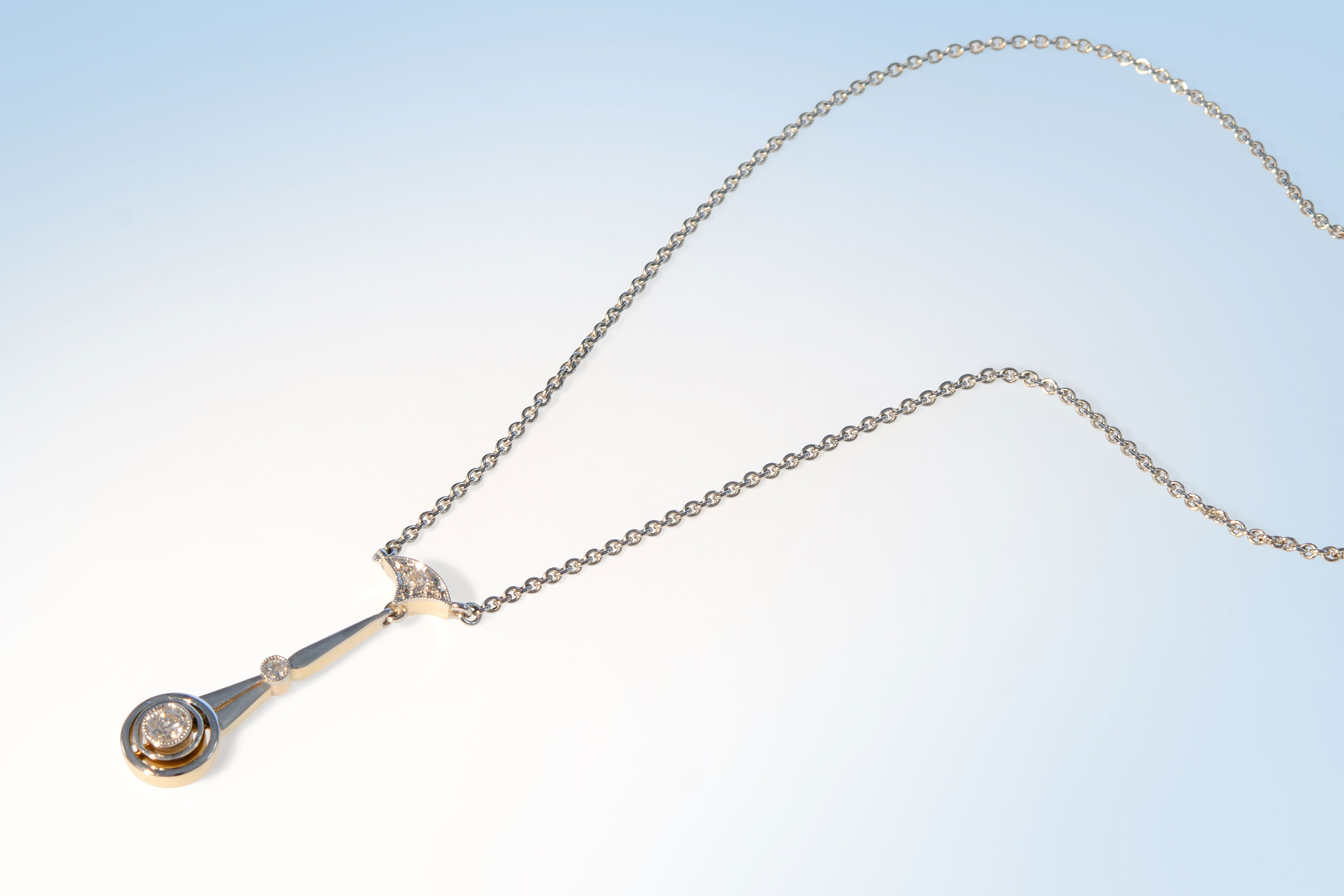 Aparter Halsschmuck aus der Zeit um 1900. Der stilvolle Anhänger ist aus Gold 585 gearbeitet, welches auf der Oberseite mit Platin beschichtet ist. Drei hübsche Diamanten im Altschliff sorgen für den nötigen Glitzer. Die Kette aus Platin 950 hat eine Länge von 44 cm.