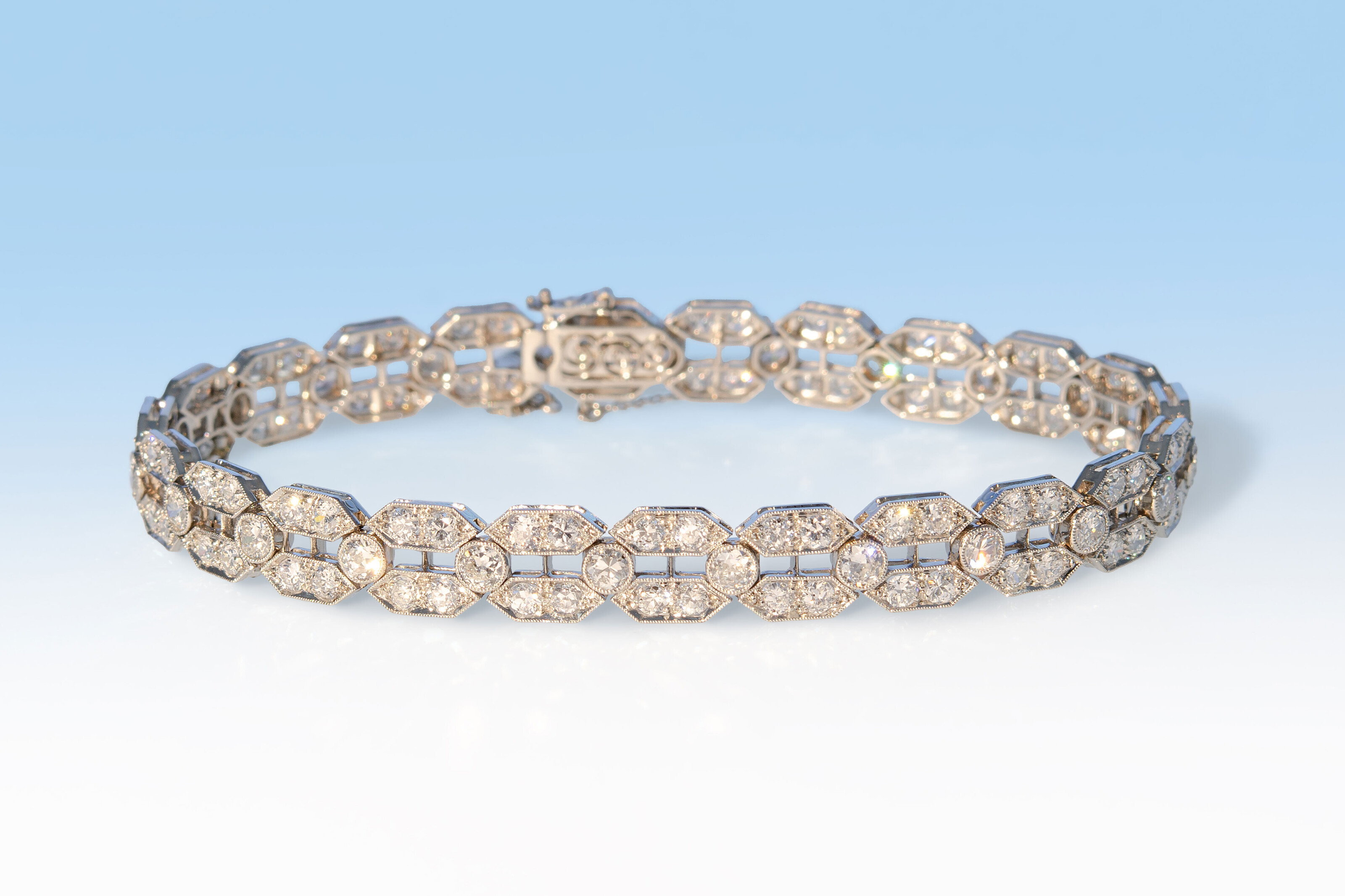 Sehr ansprechend und charmant glitzert dieses elegante Armband aus der Zeit des Art Déco. Es ist zwar mit einer ansehnlichen Menge Diamanten bestückt, erweist sich dank seiner feinen Verarbeitung aber als durchaus alltagstauglich und unkompliziert. Das Armband ist aus Platin gefertigt und es sind 115 Diamanten mit insgesamt ungefähr 6.0 ct. in der Qualiät H si-P1 (weiss, kleine Einschlüsse) darin eingefasst. Bei einer Länge von 18 cm misst es 7.4 mm in der Breite.