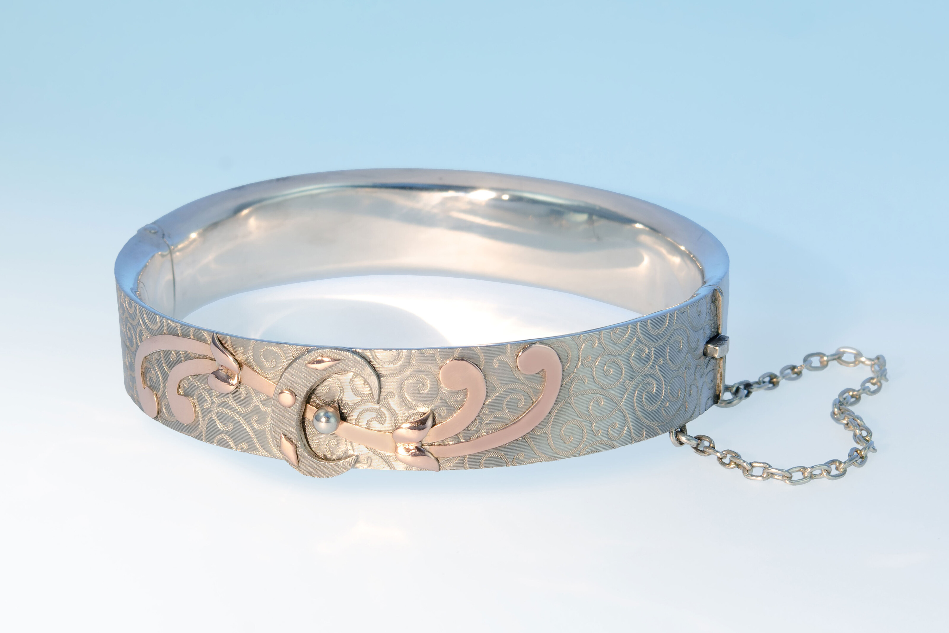 Ein dekorativer und eigenwilliger Armreif aus Österreich-Ungarn, entstanden in der Zeit um 1880. Er ist aus Silber 800 gefertigt und mit Applikationen aus Rotgold versehen. Dieser hübsche Armschmuck misst 12.4 mm in der Breite, lässt sich dank einem Scharnier und einem soliden Verschluss öffnen und ist in tadellosem Zustand erhalten.