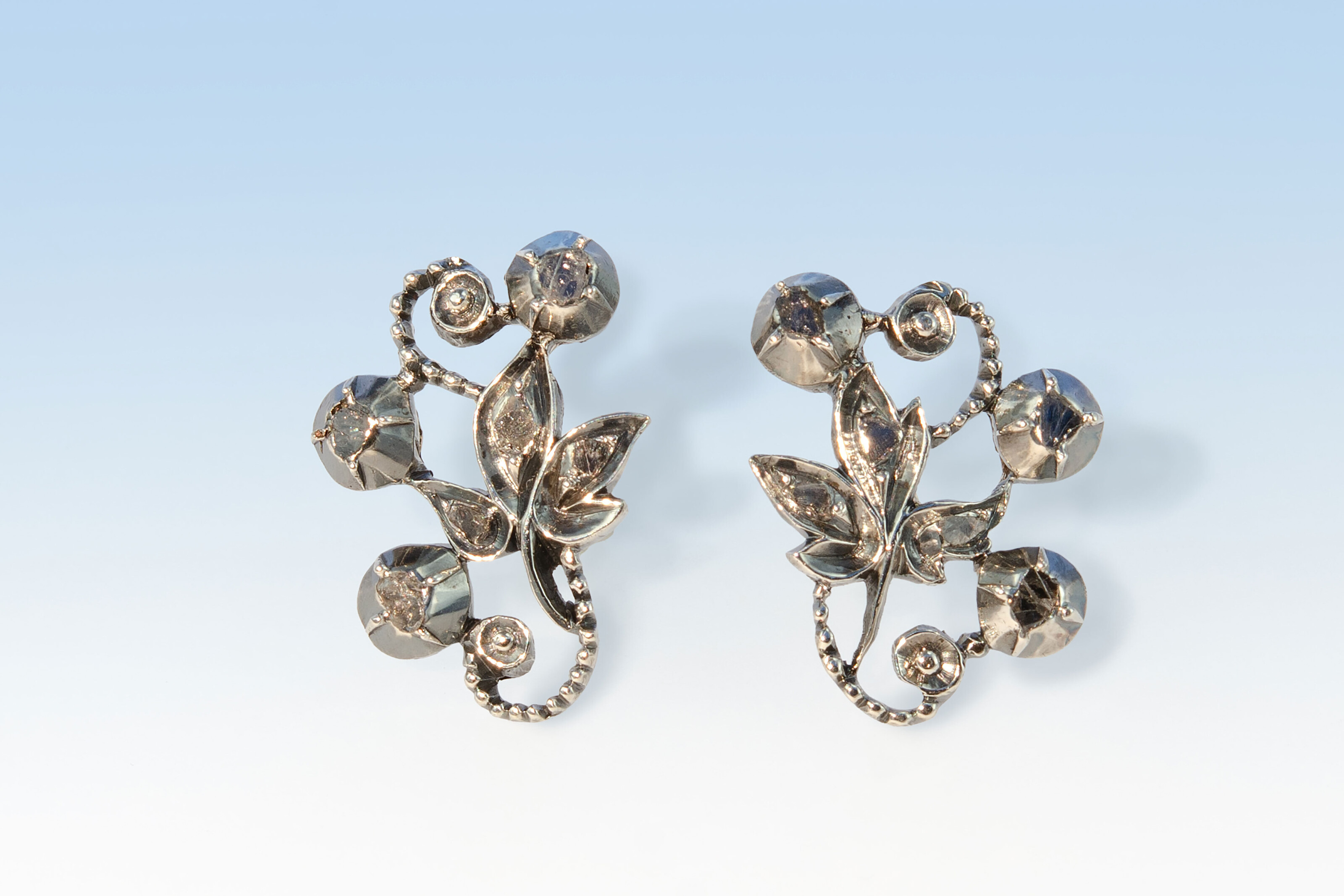 Einzigartige Ohrstecker in einem verspielten floralen Motiv aus der Zeit um 1850. Sie sind aus Silber gefertigt und auf der Rückseite mit Rotgold verstärkt. Jeweils 6 Diamanten im Rosenschliff verleihen dem Blatt und den Blütenknospen einen dezenten Glanz. Wir haben diesen attraktiven Ohrschmuck mit einem neuen, robusten Stecksystem aus Rotgold 750 versehen. Aussenmasse 13 x 20 mm.