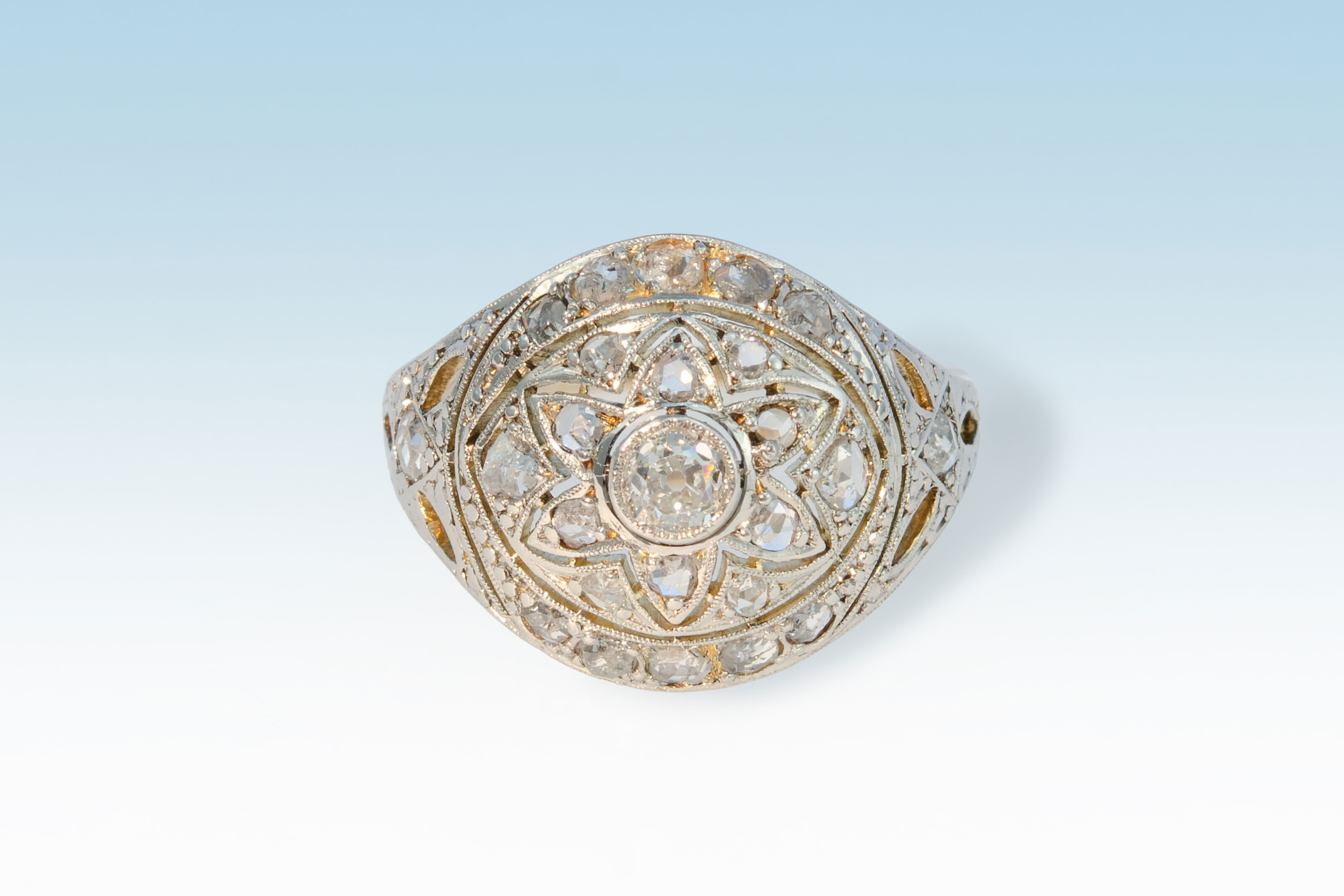Ein sehr schöner Ring aus Platin und Gelbgold 750 mit Diamanten, entstanden in der Zeit um 1900. Die grosszügige runde Form wirkt dank der durchbrochen gearbeiteten und mit Diamanten im Rosenschliff besetzten Fläche sehr leicht und elegant. Der Ringkopf misst 16.3 mm im Durchmesser und in seiner Mitte thront ein Diamant von 3.8 mm. Ringgrösse 55.