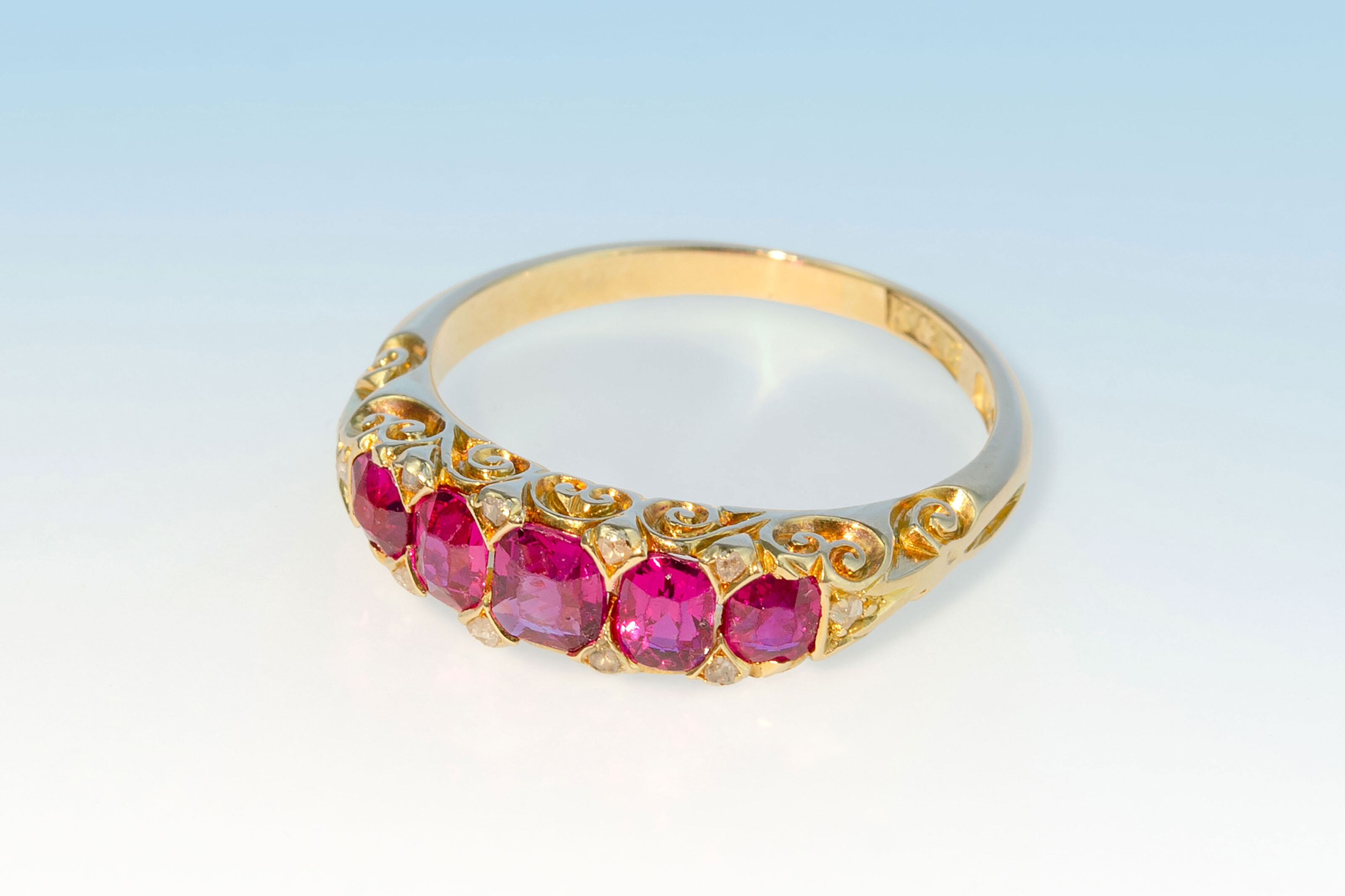 Die Rubine in diesem eleganten Ring haben einfach eine unwiderstehliche Farbe. Er stammt aus England und wurde in der Zeit um 1850 aus Gelbgold 750 gefertigt. Die 5 Rubine messen 3.2 bis 4.2 mm im Durchmesser und in den Zwischenräumen sind 10 winzige Diamanten im Rosenschliff gefasst. Grösse 54.