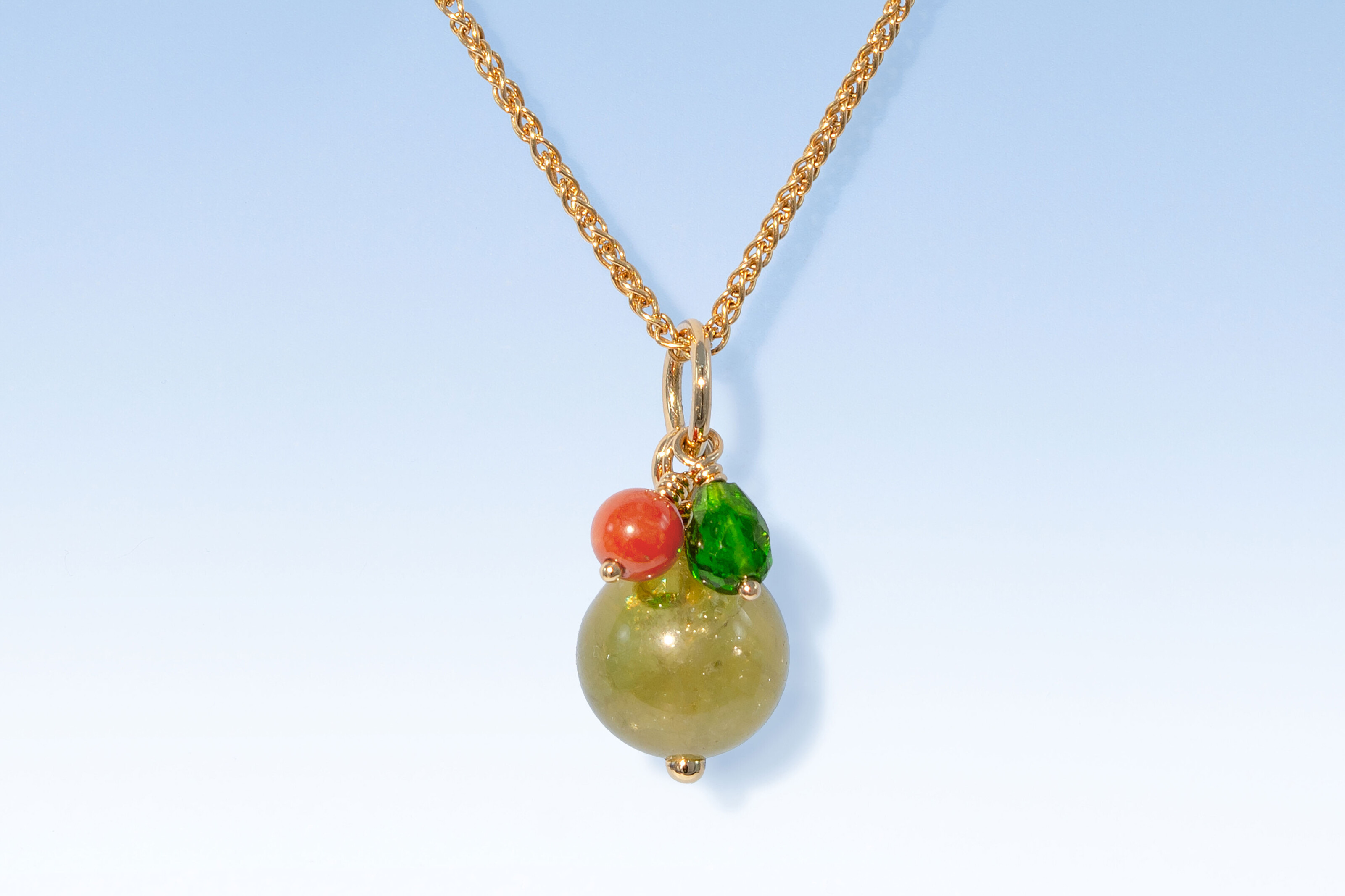 Hier kommt ein helles und ein dunkles Grün, im Kontrast mit einem satten Orange. Der hübsche Anhänger in dieser frischen Farbkombination besteht aus einer Kugel aus grünem Mali-Granat mit Durchmesser 9.6 mm, einem Tsavorit in Tropfenform und einer kleinen Korallenkugel. Alle Steine sind in Gelbgold 750 gefasst und lose an einer Oese zusammengehalten.