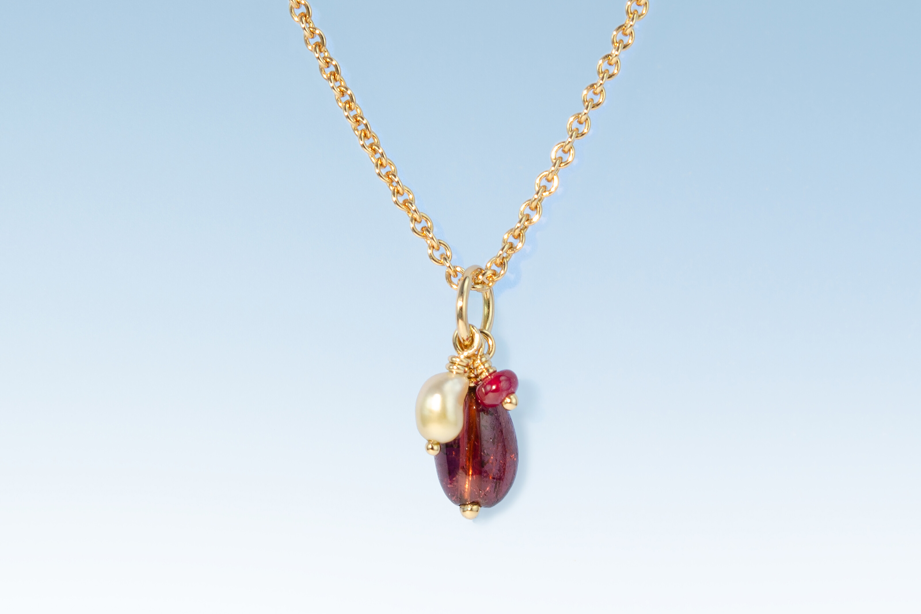 Schöner, kleiner Anhänger mit rotem Turmalin, Rubin und einer goldfarbenen Tahiti-Keshi-Perle. Der Turmalin misst 6 x 9 mm und ist zusammen mit dem Rubin und der Perle in Gelbgold 750 gefasst. Alle Elemente sind lose an einer Oese montiert.