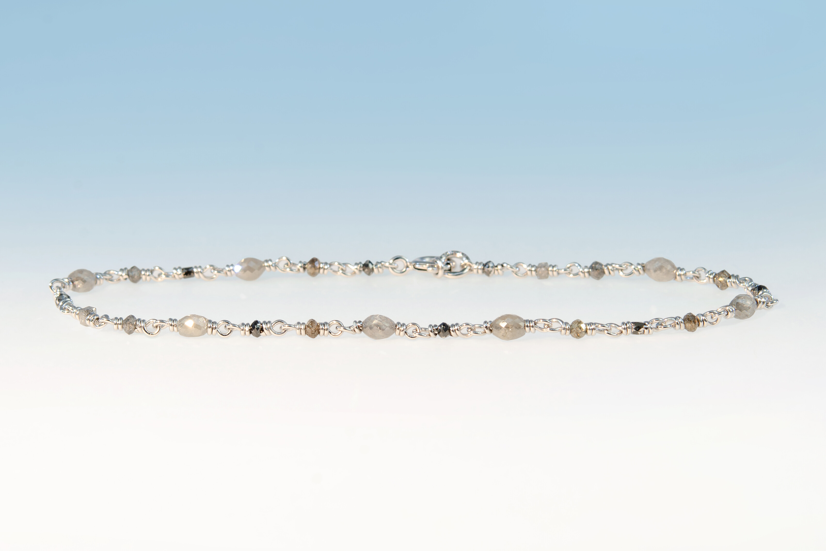 Hübsches Armband aus Weissgold 750 mit Diamanten in verschiedenen Schliffen. Die olivenförmig geschliffenen Diamanten haben einen Durchmesser von 2.8 mm. Länge 18 cm.