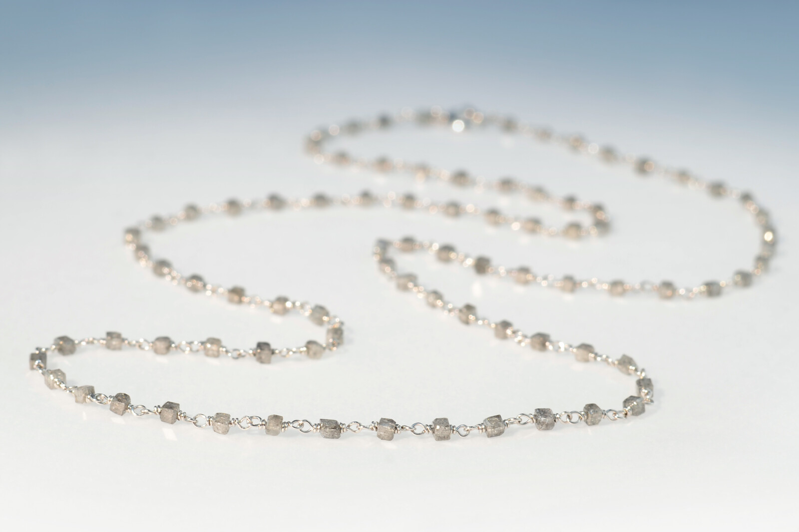 Kette mit naturfarbenen grauen Diamanten, welche in Form von kleinen Kuben geschliffen sind. Von Hand montiert auf Draht aus Weissgold 750 rhodiniert. Die Steine haben eine Grösse von 1.7 mm und wiegen zusammen 5.5 Carat. Länge 45 cm.