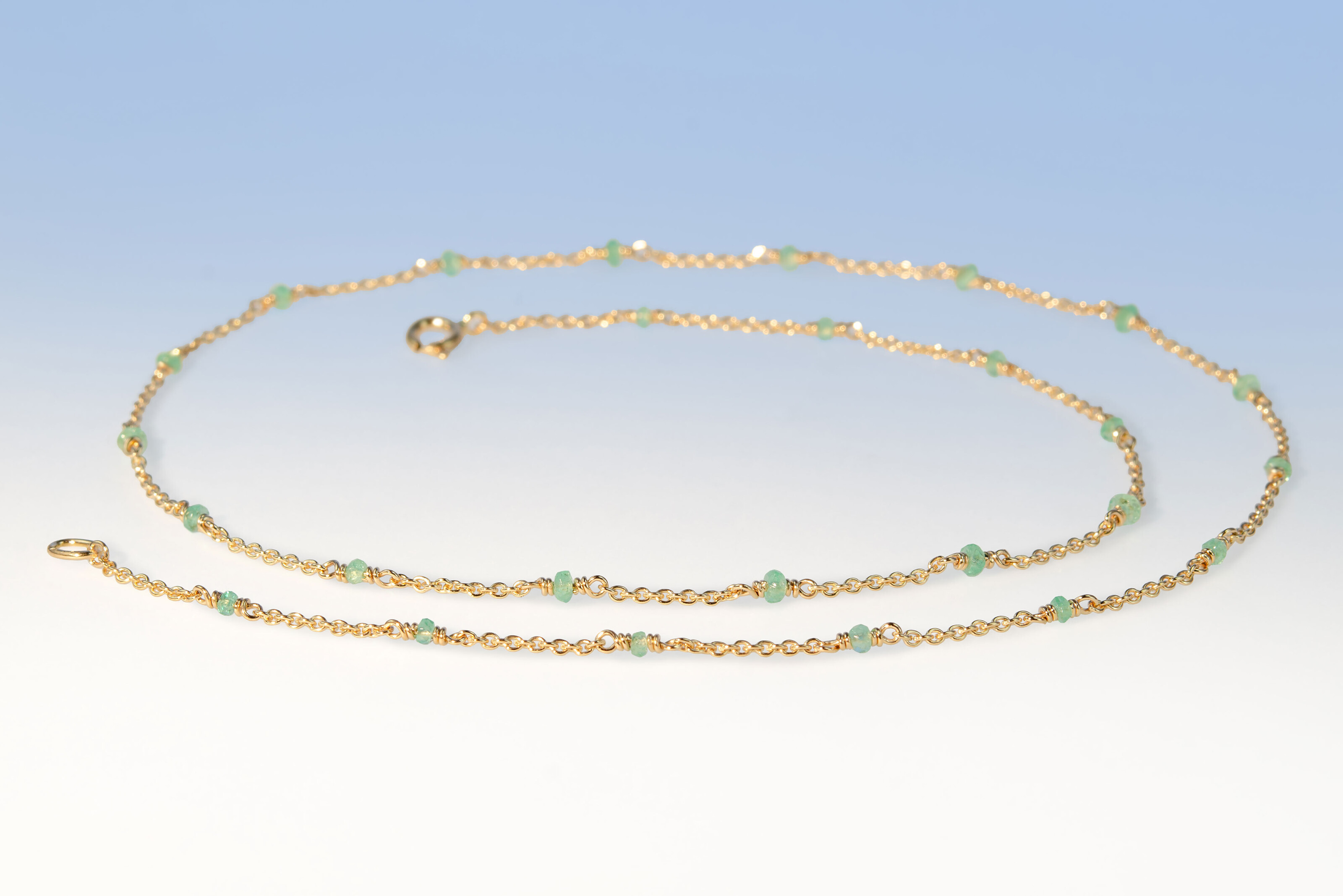 Liebliche Kette mit 26 hellen Smaragden. Die Steine messen 2 mm im Durchmesser und die Kette hat eine Länge von 44 cm.