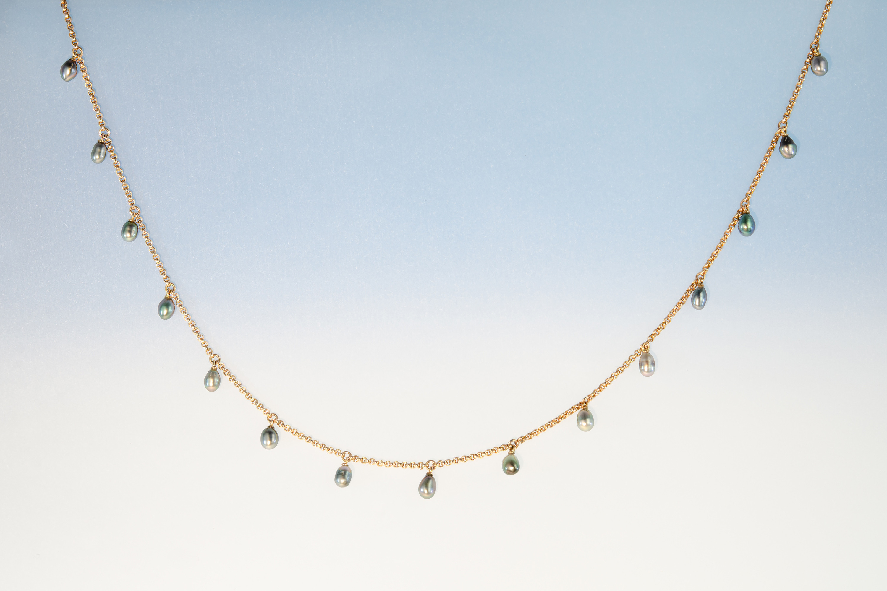 Aparte Kette aus Rotgold 750 mit 24 Keshi-Perlen Tahiti in Tropfenform d 2.5 - 4 mm. Länge 46 cm.