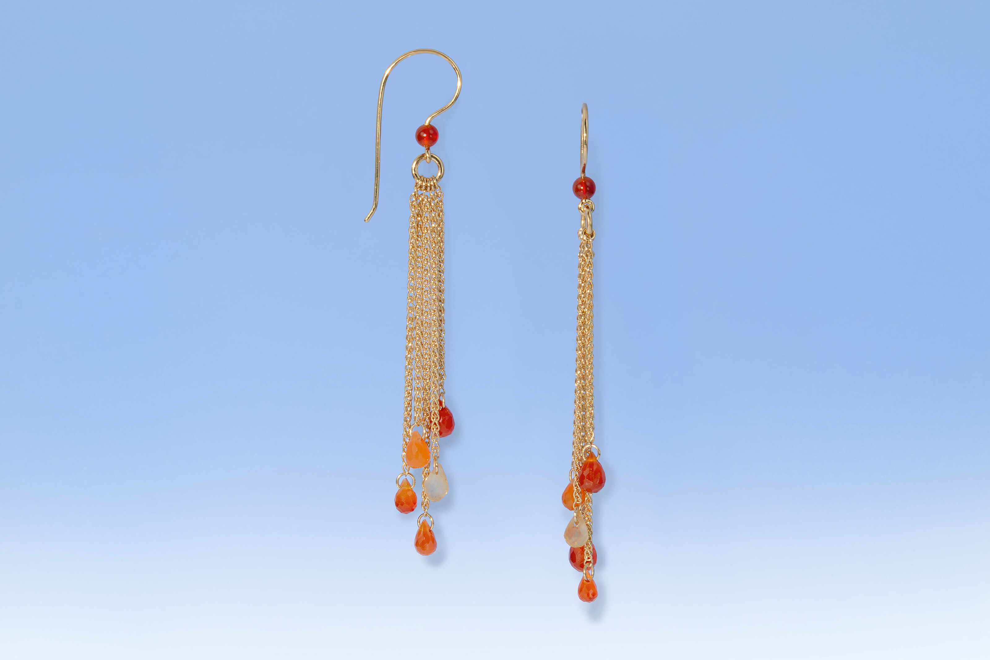 Lässige und unkomplizierte Ohrhänger aus Gelbgold 750 mit tropfenförmig geschliffenem Karneol. Jeder Stein macht den Abschluss an einer von fünf verschieden langen Ketten, welche oben zu einem Bündel zusammengefasst sind. Gesamtlänge 7 cm.