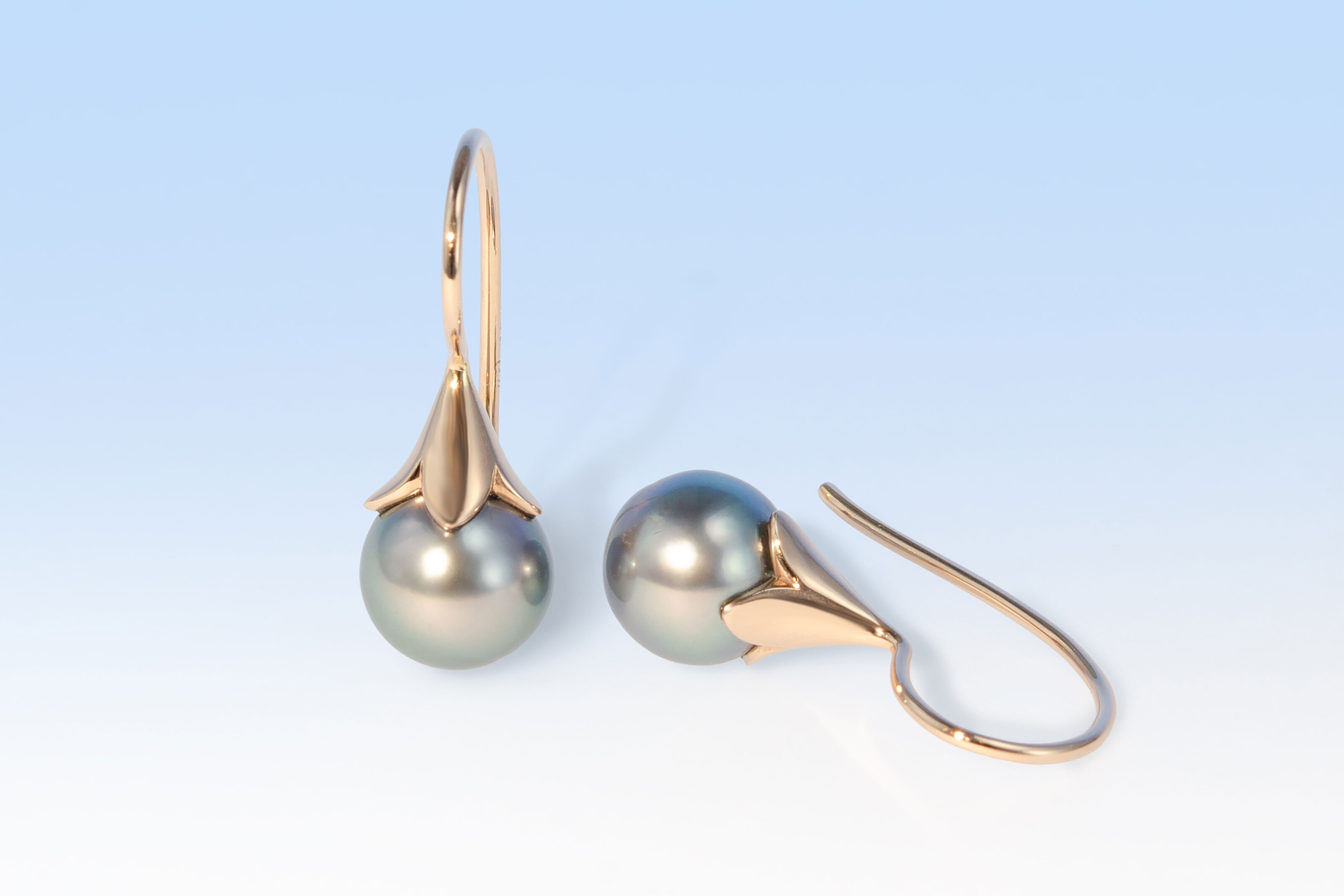 Die Kombination von Rotgold und dem dunkel schimmernden Grauton der Tahitiperlen verleiht diesen allerliebsten kleinen Ohrhängern eine zeitlose Eleganz. Die edlen Perlen haben einen Durchmesser von 8 mm und sind in unserer blattförmig gestalteten Fassung aus Rotgold 750 gehalten.