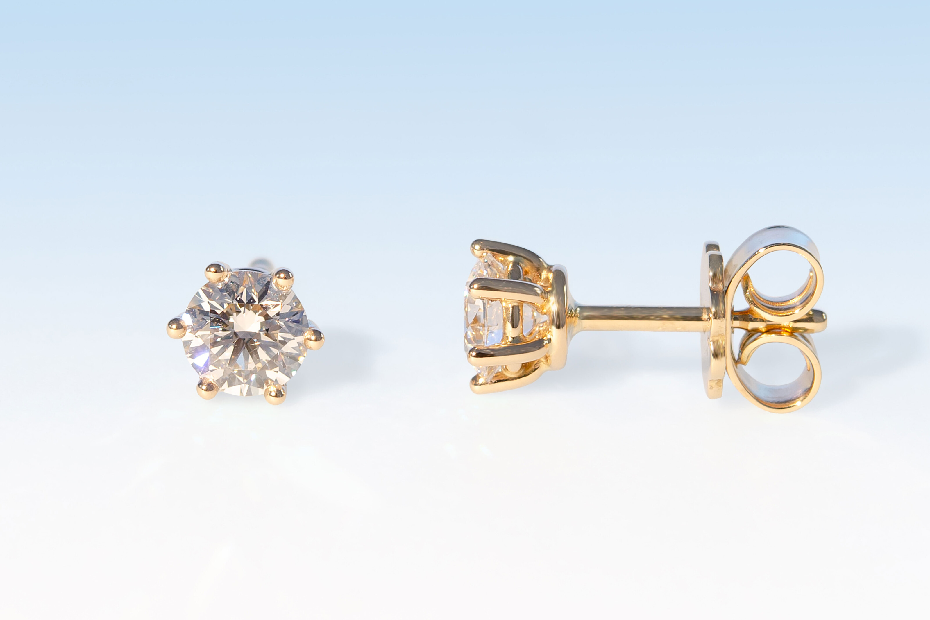 Umwerfend schön glitzern und funkeln diese Diamanten am Ohr! Es sind wunderbare Steine von bester Qualität (E vs1, hochfeines Weiss, sehr kleine Einschlüsse) und sie sind in einer klassischen Fassung aus Roségold 750 gehalten. Mit einem Durchmesser von jeweils 4.7 mm wiegen die Diamanten zusammen 0.8 Carat.