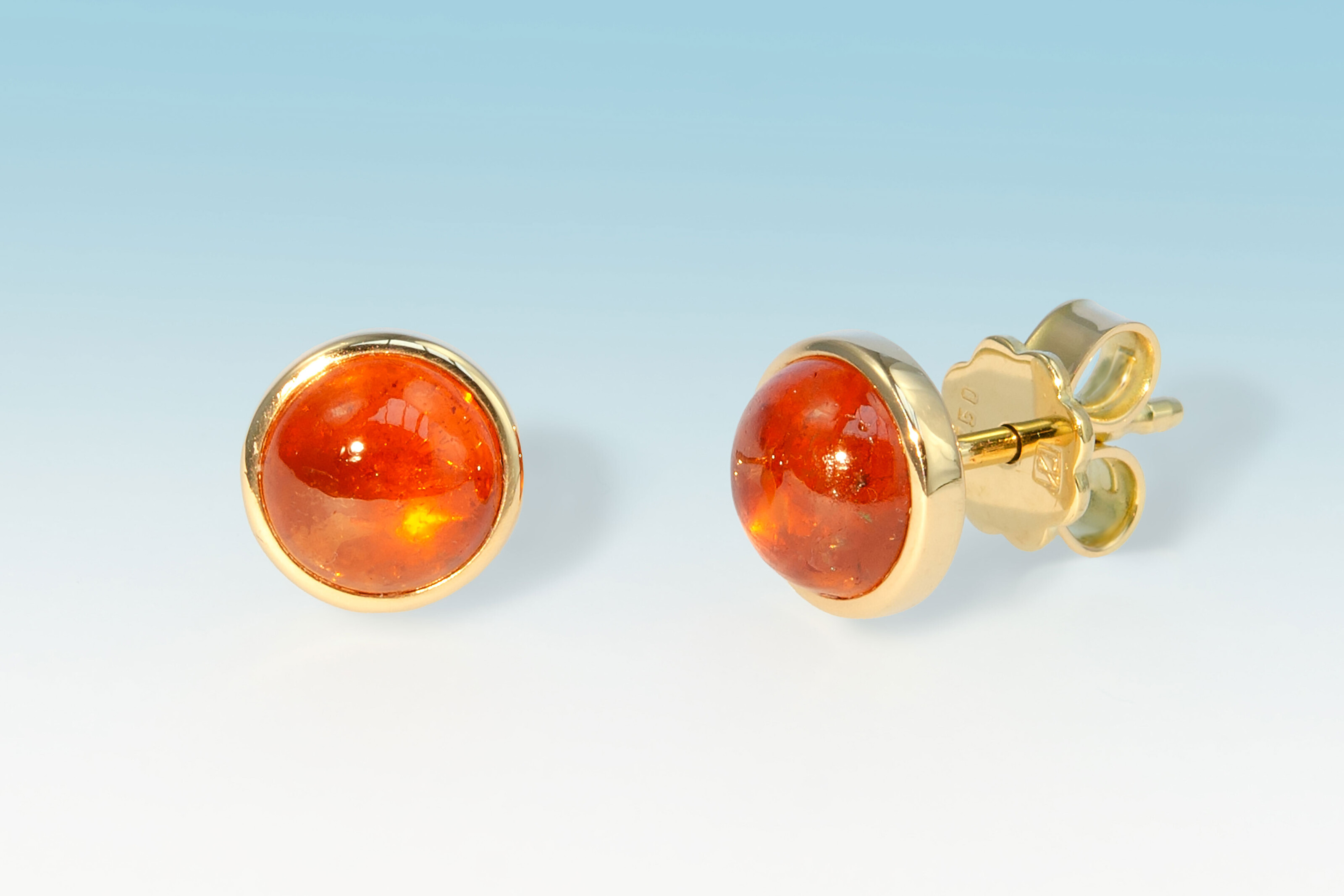 Diese aparten Ohrstecker bringen Farbe ins Leben und in Ihre Garderobe. Die wunderbar orange leuchtenden Mandaringranate messen 6.7 mm im Durchmesser, wiegen zusammen 3.92 ct. und sind in Gelbgold 750 gefasst.