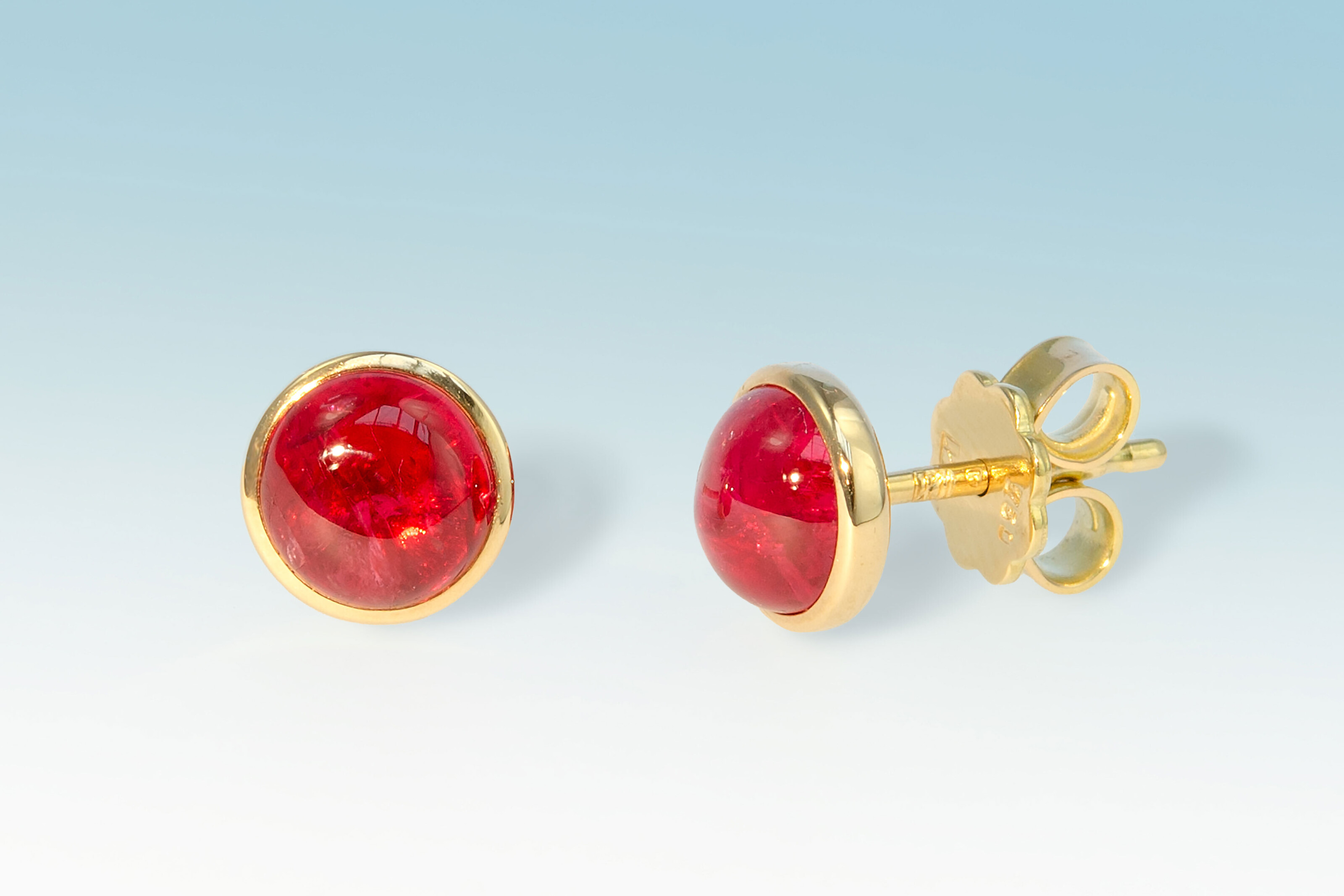 Man kann sich kaum sattsehen am frischen Himbeerrot der einzigartigen Edelsteine, welche diesen Ohrschmuck zieren. Es handelt sich um kostbare rote Spinelle, mit jeweils einem Durchmesser von 6.4 mm. Die Steine wiegen zusammen 3.17 ct. und sind in Gelbgold 750 gefasst.