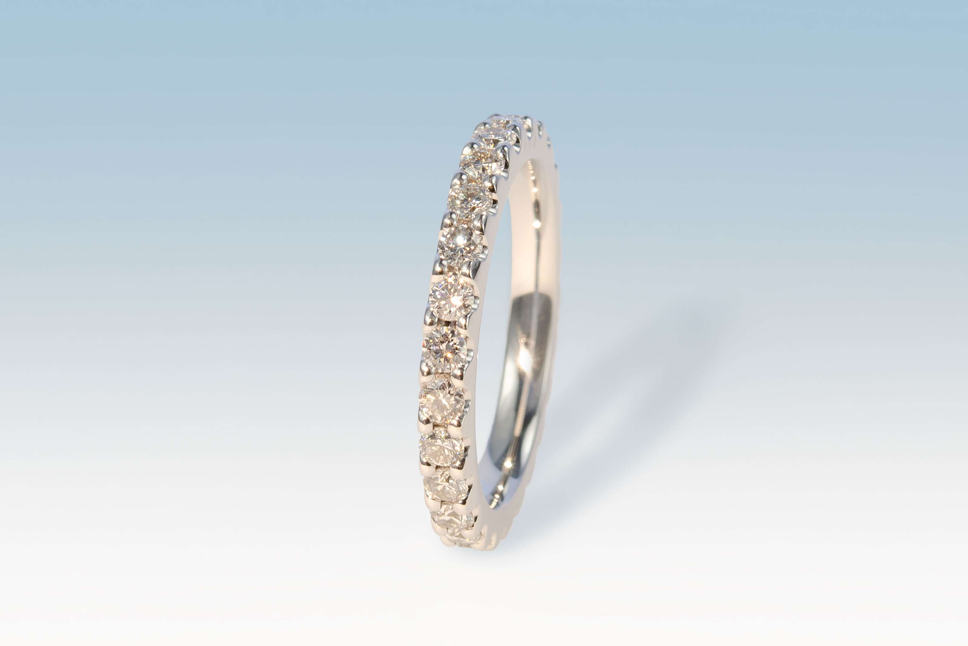 Dieser edle Diamantring gehört zu unseren Klassikern und wir fertigen ihn nach Wunsch in verschiedenen Varianten an. Jeder Stein wird von jeweils 2 schön abgerundeten Griffen gehalten und die Seiten des Ringes sind flach. Dieses Exemplar ist aus Weissgold 750 gefertigt und trägt insgesamt 26 Diamanten im Brillantschliff mit Durchmesser 2.2 mm von feinster Qualität (TW vs, total 1.066 ct.). Ringgrösse 53.