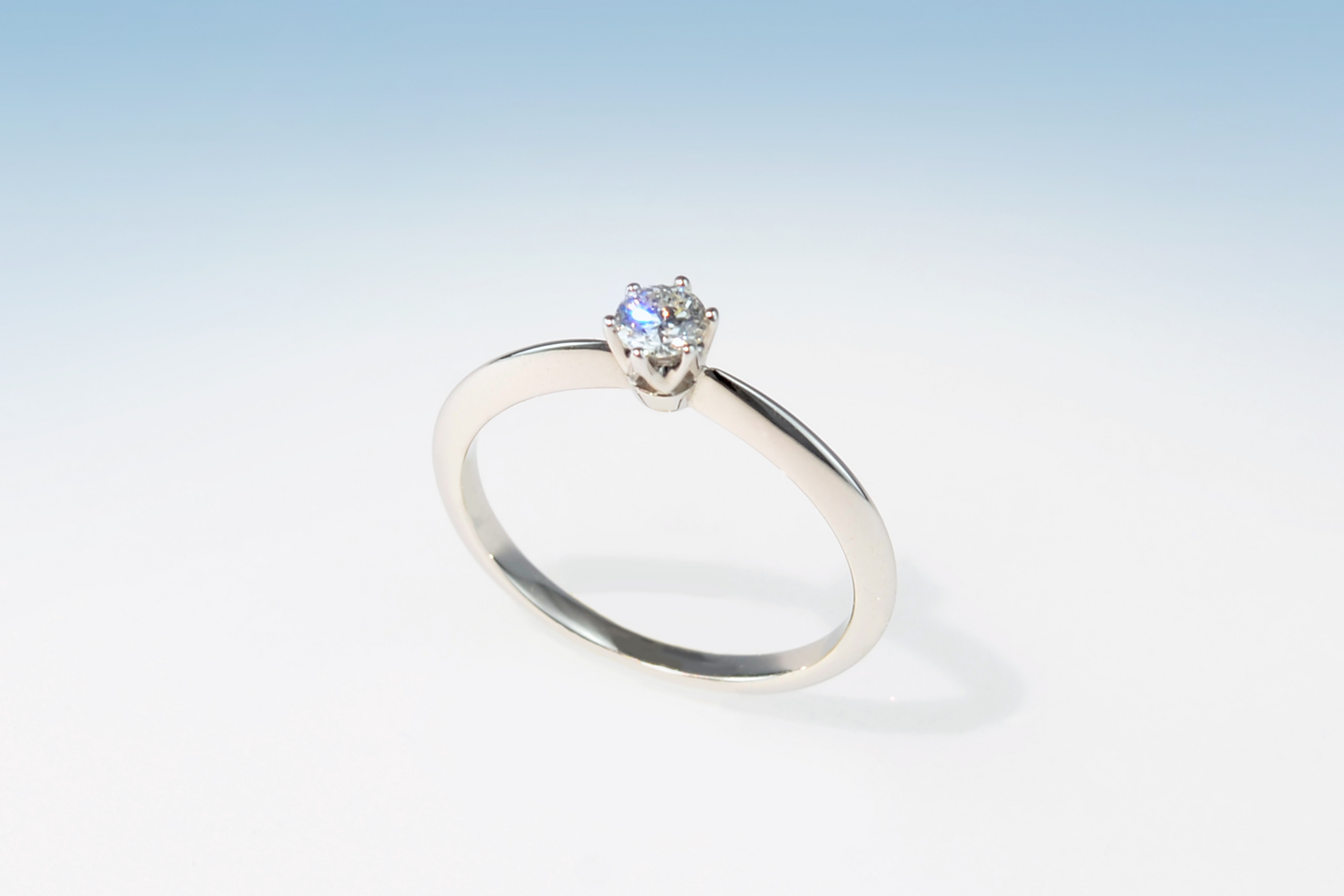 Ring aus Weissgold 750 rhodiniert mit einem Diamanten im Brillantschliff von feiner Qualität (TW vs). Der Stein hat einen Durchmesser von 3.6 mm und wiegt 0.175 Carat. Grösse 51.