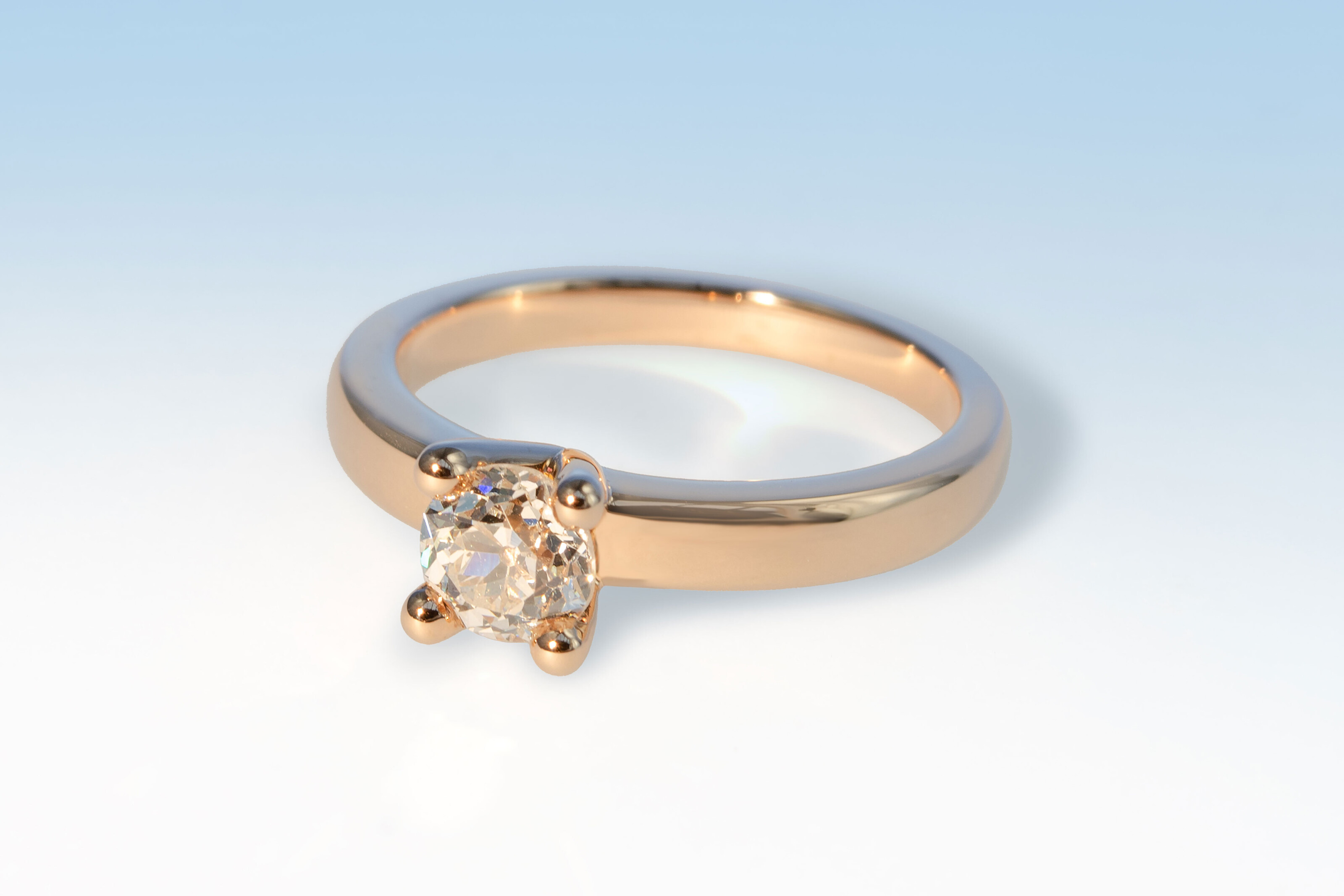 Ein wunderschöner Diamant im alten Schliff schmückt diesen exklusiven und markanten Solitaire-Ring aus Rotgold 750 und macht ihn unverwechselbar. Er verrät unsere Liebe für antiken Schmuck. Wir haben dafür einen alten Diamanten verwendet, welcher aus einem Familienbesitz stammt. Dieser faszinierende Stein in der Qualität K si2 (getöntes Weiss, kleine Einschlüsse) hat ein lebendiges und unwiderstehliches Funkeln (in der Fachsprache "Feuer" genannt), wiegt 0.8 ct. und misst 5.7 mm. Grösse 56.