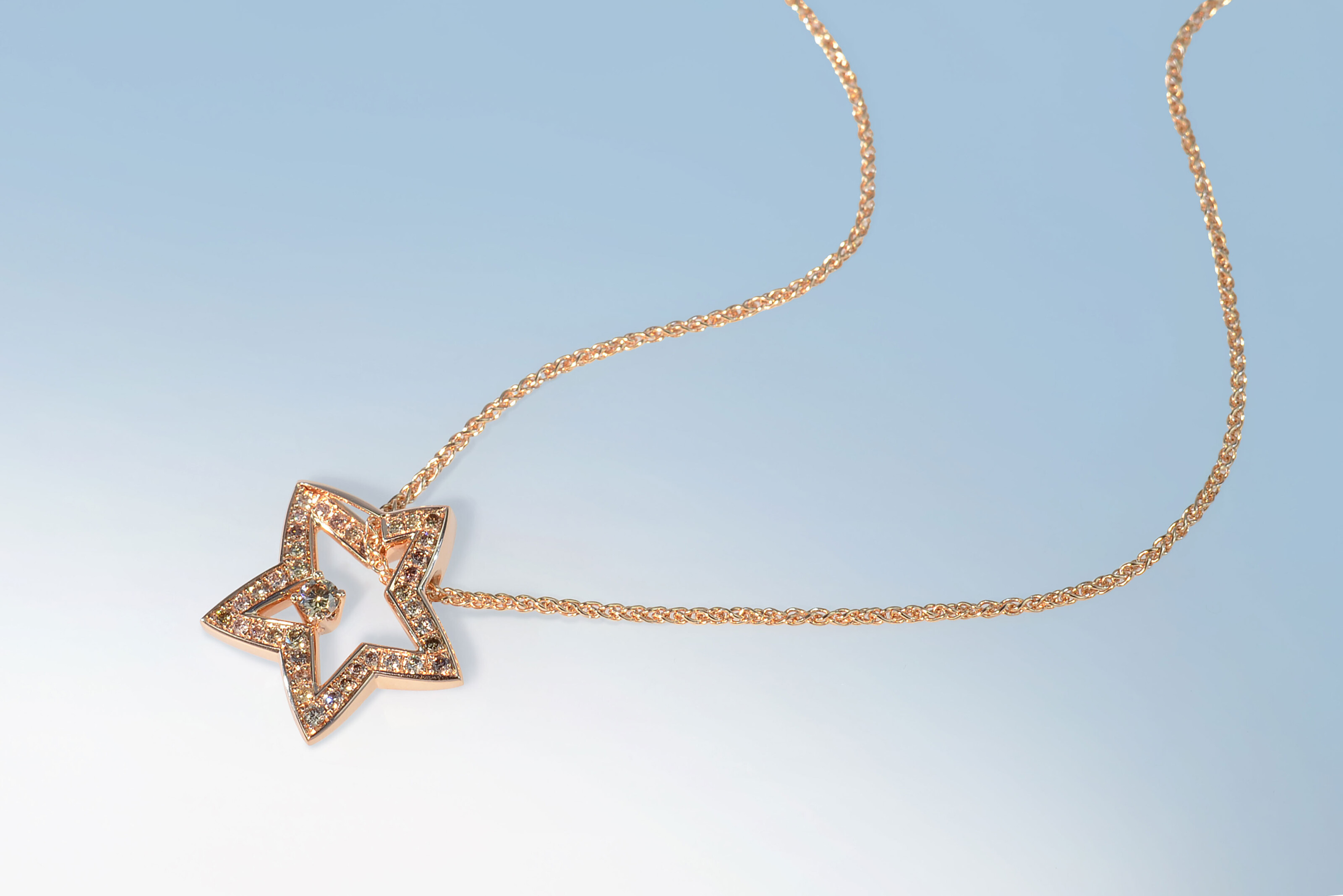 Einen glitzernden Stern an einer Kette um den Hals zu tragen war der Wunsch unserer Kundin. Wir haben für sie diesen mit naturfarbenen Diamanten ausgefassten Anhänger aus Rotgold 750 entworfen und hergestellt.