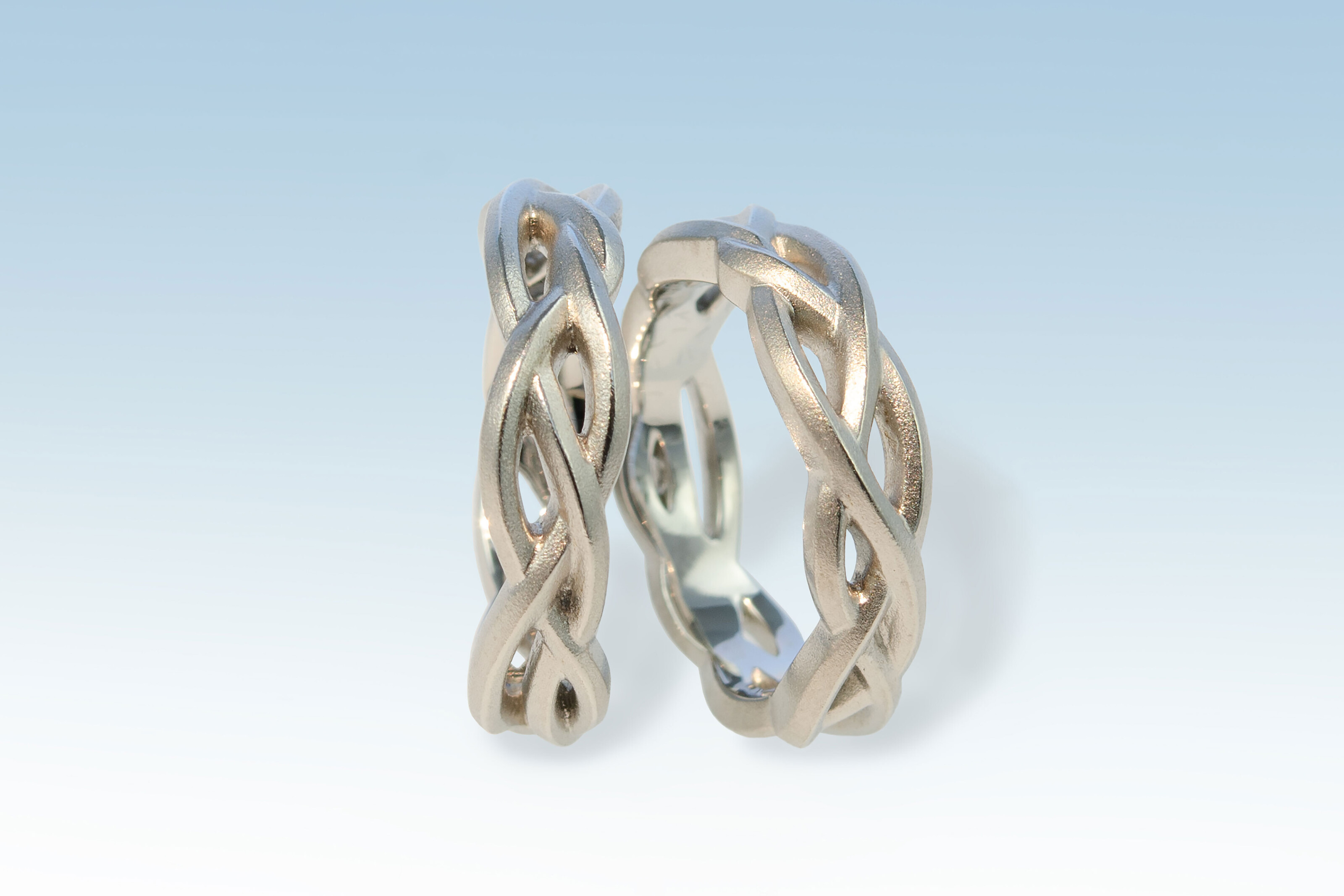 Das spezielle und verspielte Design dieser aparten Ringe stammt aus unserer Kollektion. Wir habe sie hier für unsere Kundinnen in Platin angefertigt.