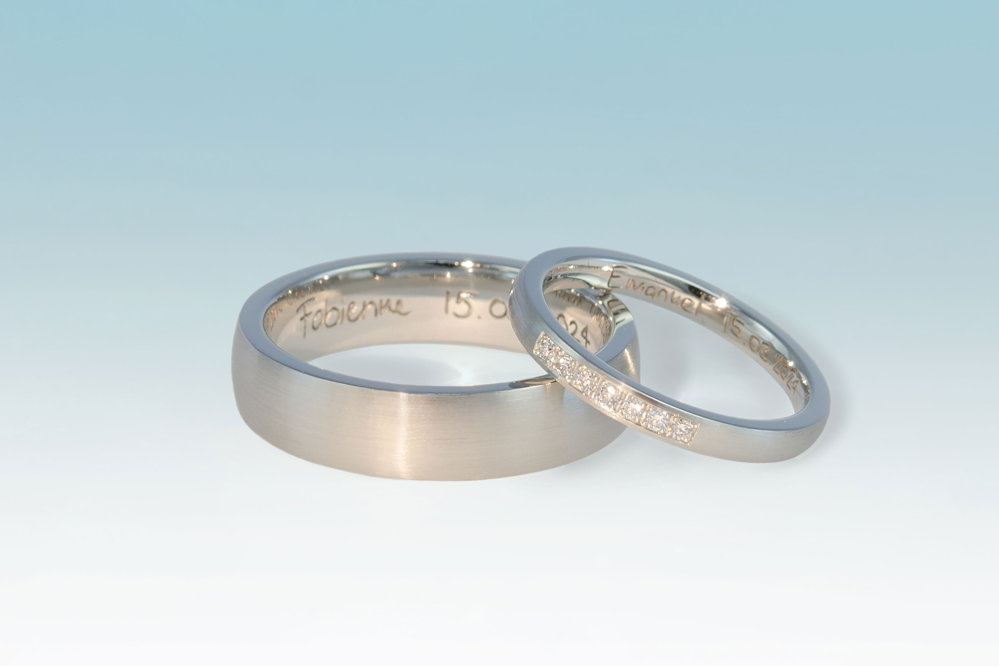 Elegante, klassische Ringe aus Platin 950. Den hübschen Ring für die Dame vollendet eine feine Linie aus glitzernden Brillanten.